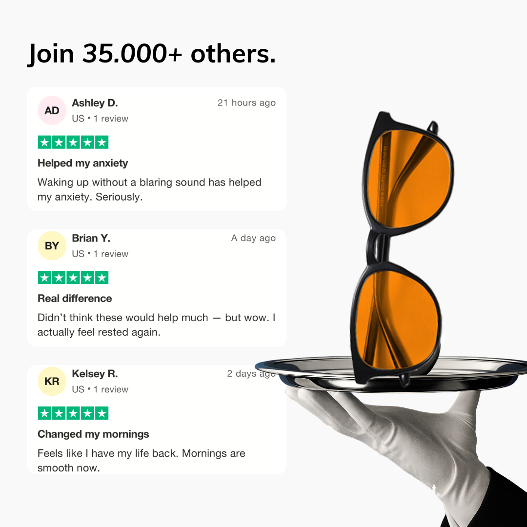 Blue light from screens in the evening suppresses the production of melatonin — the hormone that helps you fall asleep. This can lead to shallow sleep and difficulty waking up. Deep Sleep glasses filter out this disruptive light, allowing your body to naturally prepare for rest. The result: faster sleep onset, more REM sleep, and easier mornings.